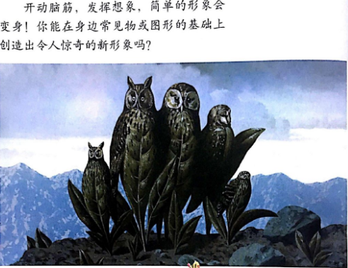 学生思考后回答,教师总结:作品运用生活中常见的叶子组成了全新的猫头鹰形象。